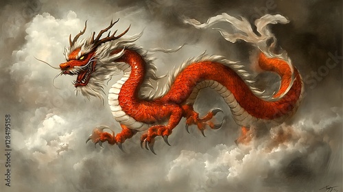 © Yuto, Obraz premium Fiery Red Dragon Soaring Through Misty Clouds: Digital Painting AI Generated