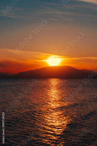 © chaossart, Fototapeta premium Fiery red sunset over Issyk-lul lake in Kyrgyzstan