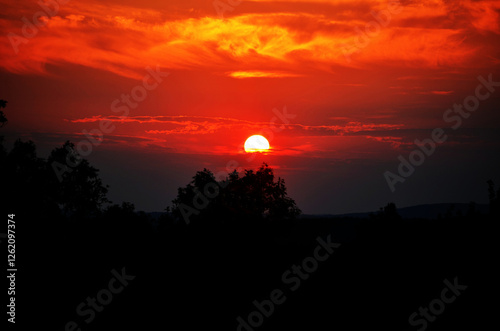 Fototapeta premium Fiery red sunset over silhouetted trees with a dramatic sky