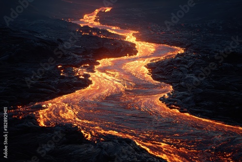 © Dawi, Fototapeta premium Fiery River - Molten Lava Flowing Through Dark Landscape, Volcanic Eruption.