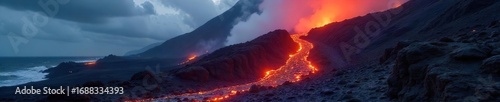 © Buri, Fototapeta premium Fiery River of Molten Rock Dramatic Lava Flow on a Hawaiian Volcano Slope