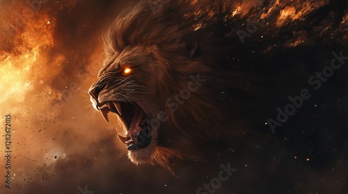 © NguyenQuoc, Naklejka premium Fiery Roaring Lion Majestic King of the Jungle in a Cosmic Inferno
