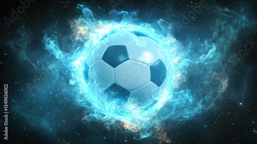 © Oddo Art, Fototapeta premium Fiery soccer ball engulfed in blue flames against a starry backdrop.