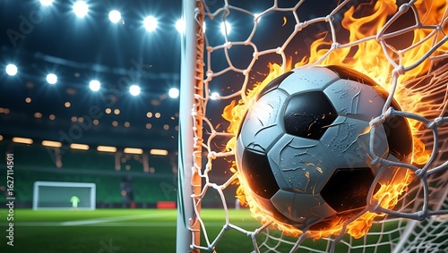 Naklejka premium Fiery soccer ball scores goal in stadium net fire