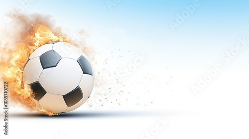 Fototapeta premium Fiery soccer ball speeding through air with flames on blue background