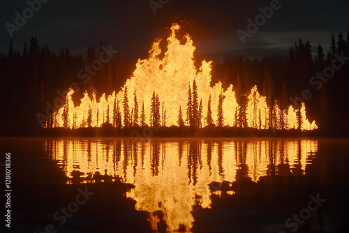 Fototapeta premium Fiery spectacle of a forest fire engulfing trees by a lake at night,...