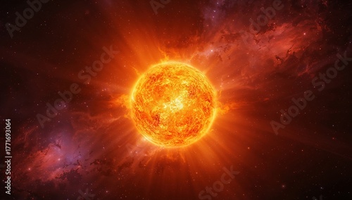 © DEER FLUFFY, Obraz premium Fiery Sphere Amidst Cosmic Dust, Abstract Space Visualization, Golden Light Burst.