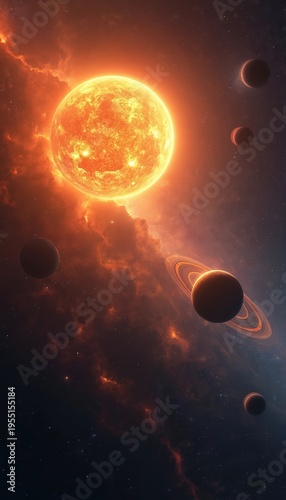 © Vadym, Fototapeta premium Fiery sun and planets in deep space nebula. Ringed planet orbits star system. Cosmic scene with distant stars and gas clouds. Galactic travel background.