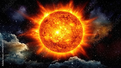 Obraz premium Fiery sun, cosmic clouds, space background; astronomy, science education