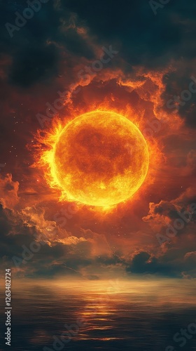 Obraz premium Fiery sun glows above the ocean amidst dramatic clouds