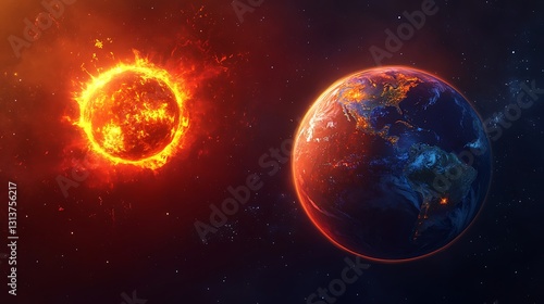 © Asrianto, Obraz premium Fiery sun irradiates Earth in space, showcasing solar flare potential for climate disaster
