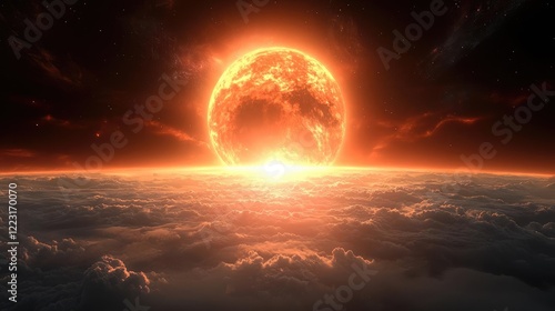 Fototapeta premium Fiery sun rising over cloudscape, cosmic background. Use science fiction,...