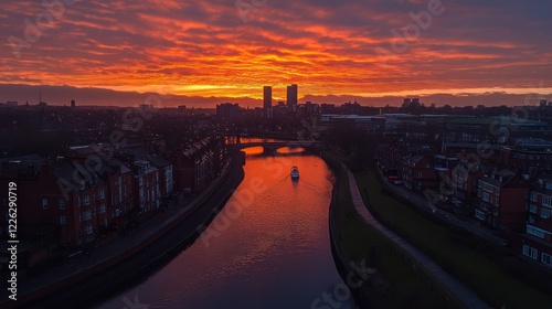© Almahyra, Fototapeta premium Fiery sunrise over city river with boat.
