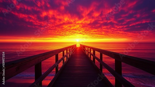 Obraz premium Fiery Sunrise Over Ocean Pier Wooden Pathway