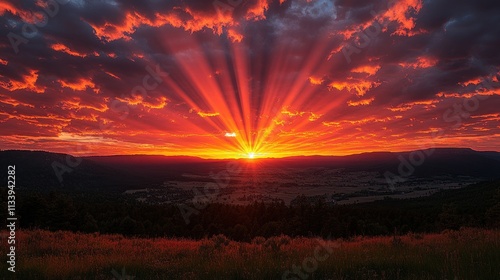 © logyartstudios, Obraz premium Fiery sunset bursting through dramatic clouds over a mountain range and field.