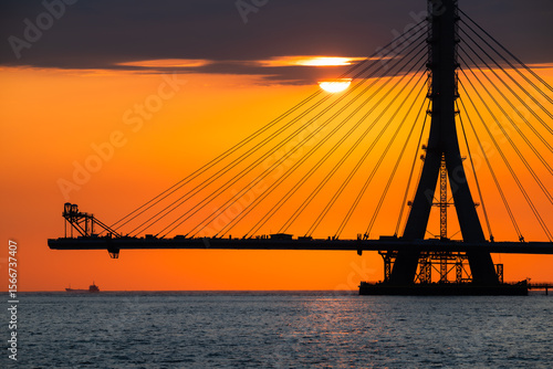 Fototapeta premium Fiery sunset casting an orange glow over the under-construction Danshui cable bridge in New Taipei Taiwan, creating a dramatic silhouette.