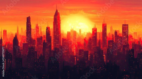 Fototapeta premium Fiery Sunset Cityscape, Epic, Digital Art