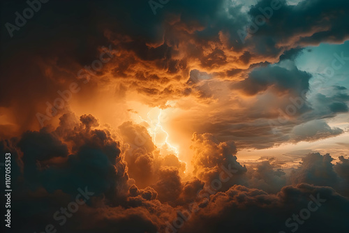 Obraz premium Fiery Sunset Cloudscape, Dramatic Lightning Illuminates Golden Hues Across a...