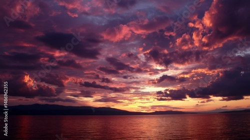 © Angsumalin, Fototapeta premium Fiery Sunset Cloudscape Over Calm Water