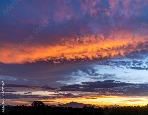 © Asep, Fototapeta premium Fiery Sunset Cloudscape Over Distant Hills