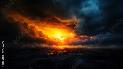 Naklejka premium Fiery Sunset, Dramatic Storm Clouds over Ocean