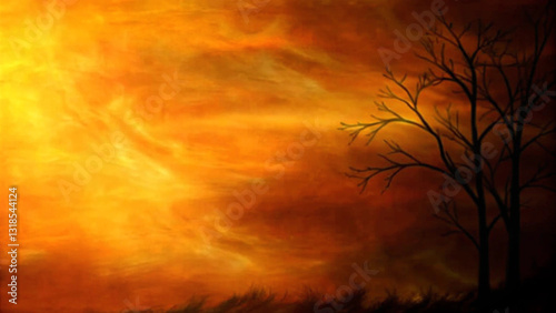 © saalim5226, Obraz premium Fiery Sunset Embracing A Solitary Tree, A Breathtaking Canvas Of Warm Golden Hues And Soft Brushstrokes