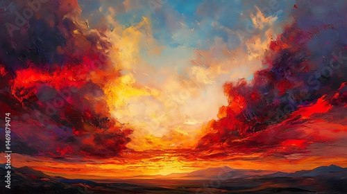 © Bagus Skak, Fototapeta premium Fiery Sunset Landscape Painting.