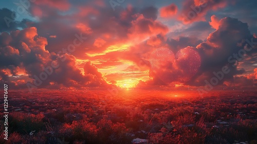 Fototapeta premium Fiery Sunset Landscape with HeartShaped Cloudscape Dramatic Sky and Reddish...