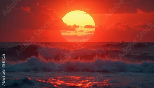 Fototapeta premium Fiery Sunset Ocean: Dramatic Waves and Golden Sun
