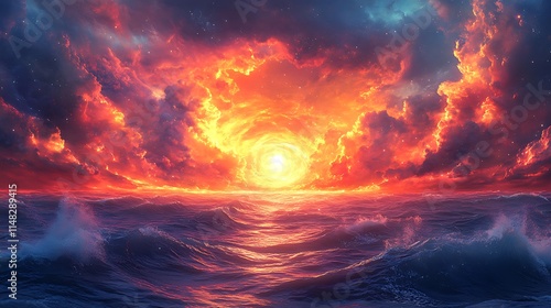 © Wida, Obraz premium Fiery Sunset Over a Dramatic Ocean Wavescape