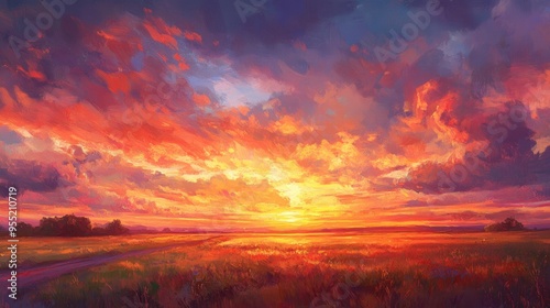 Fototapeta premium Fiery Sunset Over a Field of Tall Grass