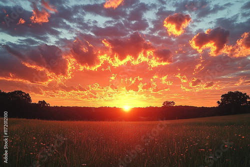 © Design Adelsa, Fototapeta premium Fiery Sunset Over a Field of Wildflowers