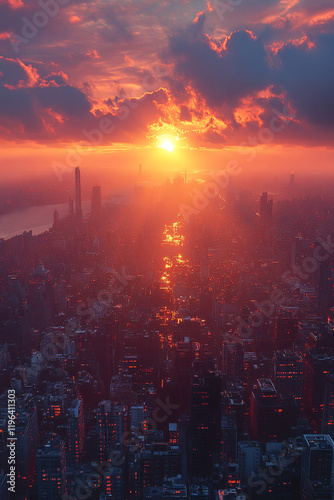 © Johanddss, Obraz premium Fiery Sunset Over a Futuristic Cityscape