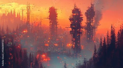 © Abi, Naklejka premium Fiery Sunset Over a Post-Apocalyptic Cityscape