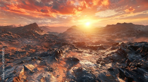 © harryaishi, Obraz premium Fiery sunset over a rugged, mountainous landscape.