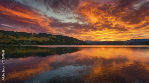 Fototapeta premium Fiery Sunset Over Calm Lake And Rolling Hills