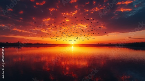 Naklejka premium Fiery sunset over calm lake, birds in flight.