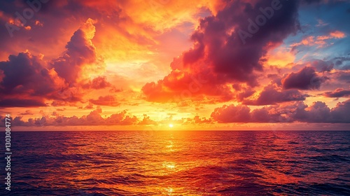 Obraz premium Fiery sunset over calm ocean; dramatic cloudscape.