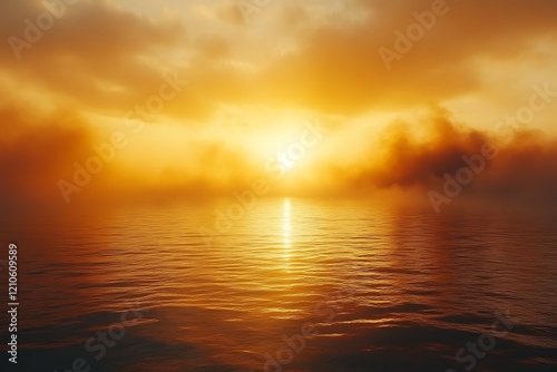 © Siti, Fototapeta premium Fiery sunset over calm ocean with fog.