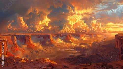 © Alienmarsh, Fototapeta premium Fiery Sunset Over Canyon Landscape
