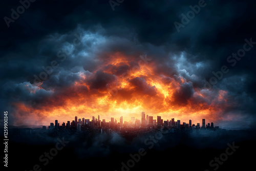 Naklejka premium Fiery sunset over city skyline with dark clouds for dramatic, impactful use