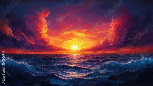 Fototapeta premium Fiery sunset over dark, ocean waves.