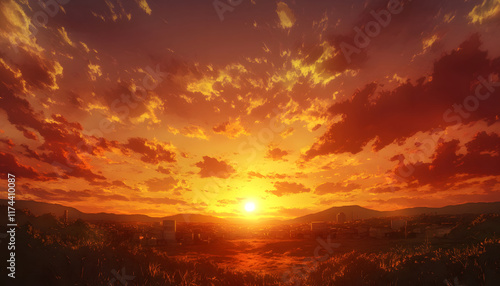 © Halfjoy, Obraz premium Fiery Sunset Over Distant Cityscape Silhouette