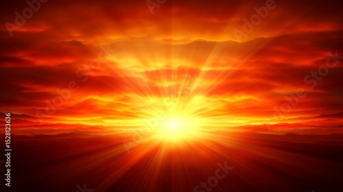 © Orawan, Fototapeta premium Fiery Sunset over Distant Mountains Dramatic Sky Sunrise Rays of Light