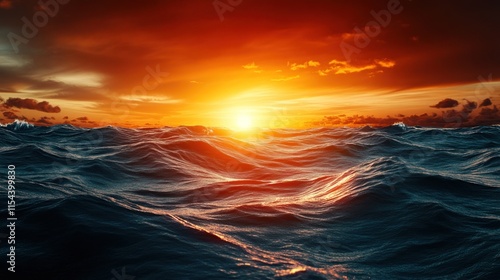 Obraz premium Fiery sunset over dramatic ocean waves.