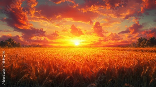 © Ali, Fototapeta premium Fiery sunset over golden wheat field.