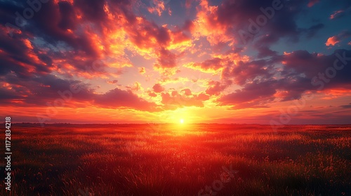© Diki prayoga, Fototapeta premium Fiery Sunset Over Grassland Field Landscape