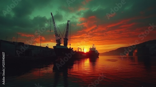 © Biancaart, Fototapeta premium Fiery Sunset Over Harbor Ships and Cranes