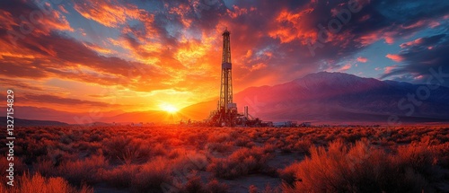 © abdul kahfi, Fototapeta premium Fiery Sunset over Oil Rig and Mountain Range