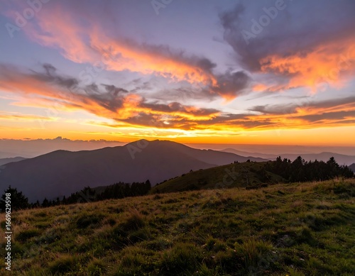 © Kiki, Obraz premium Fiery sunset over rolling hills and distant mountains